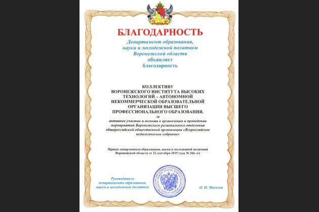 Департамент образования, науки и молодежной политики Воронежской области объявил благодарность коллективу Воронежского института высоких технологий за активное участие и помощь в организации и проведении мероприятий Воронежского регионального отделения общероссийской общественной организации "Всероссийское педагогическое собрание".